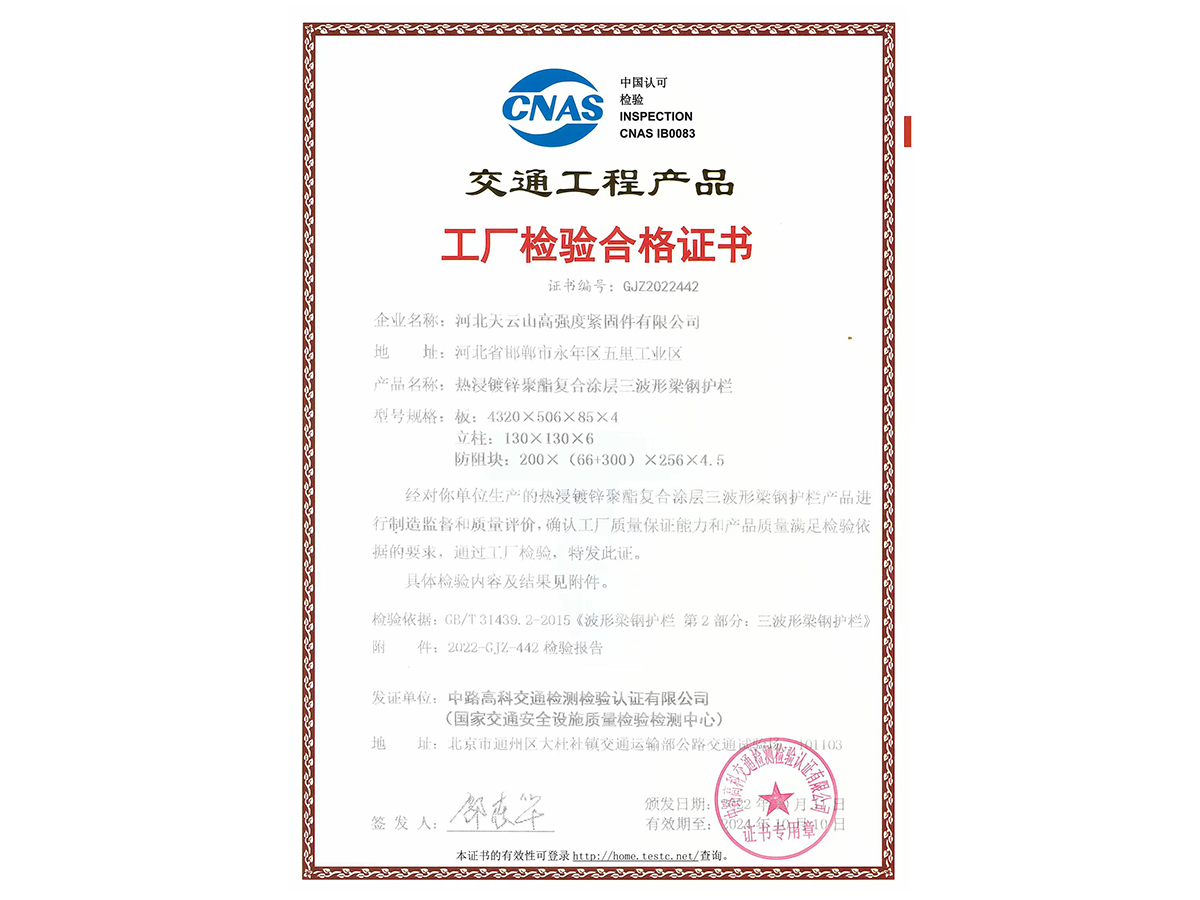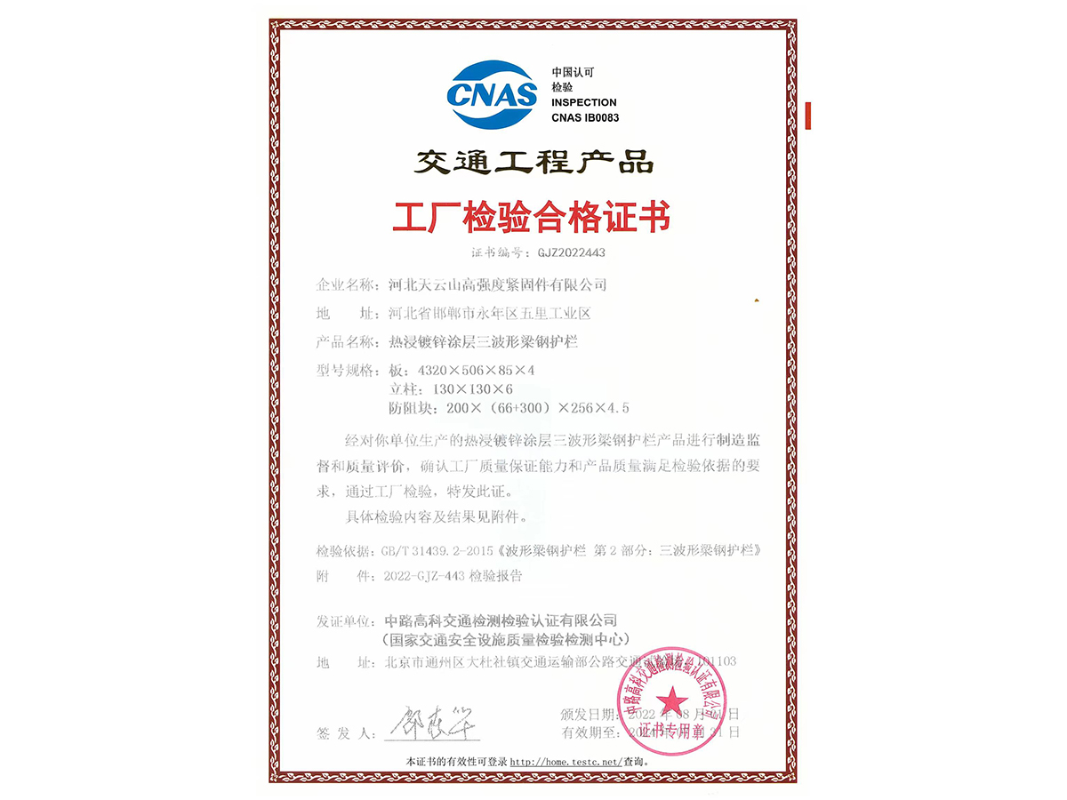 三波形梁鋼護欄工廠檢驗合格證書
